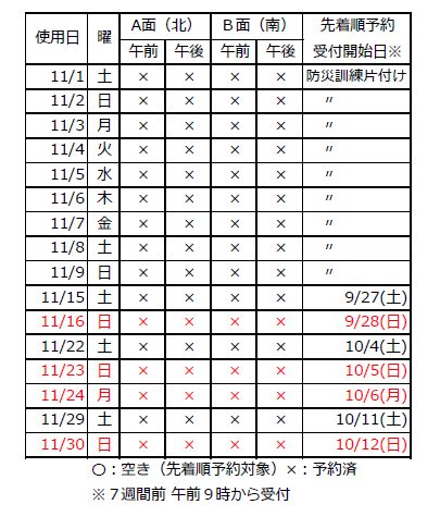 ・先着順予約 使用日の7週間前の同曜日の午前9時から使用日前日の午後5時まで